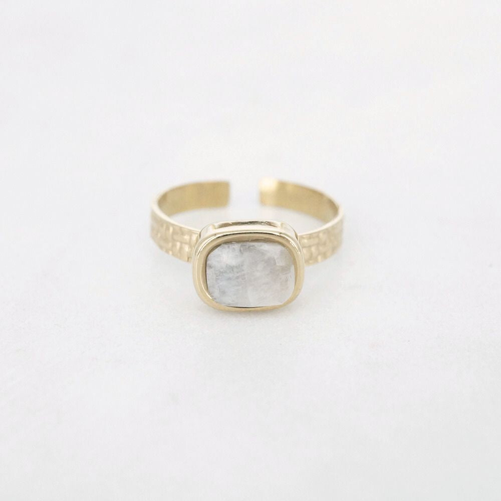 De Nouri Ring straalt rust en elegantie uit. De rechthoekige labradorietsteen heeft een prachtige, natuurlijke glans die subtiel van kleur verandert in het licht. De gehamerde band geeft de ring een speelse touch. Dankzij het open design is hij verstelbaar en comfortabel om te dragen. Gemaakt van stainless steel met een echte labradorietsteen, waardoor elk exemplaar uniek is.