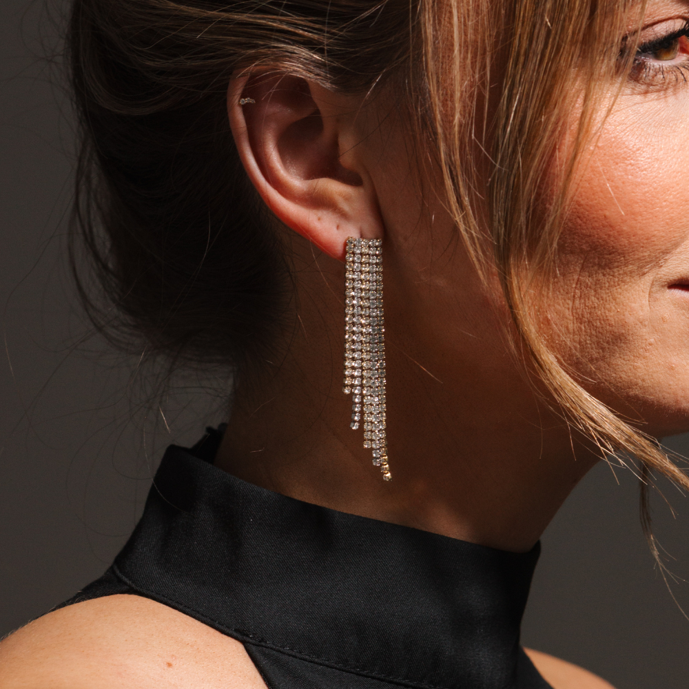 Deze glam oorbellen zijn 100% goudkleurig (stainless steel basis) en afgewerkt met sprankelende zirconia strass steentjes. De lange fringes zorgen voor een luxe look die prachtig meebeweegt, dus ideaal voor party season, bruiloften of een statement night-out outfit. Licht van gewicht, kleurvast en nikkelvrij!
