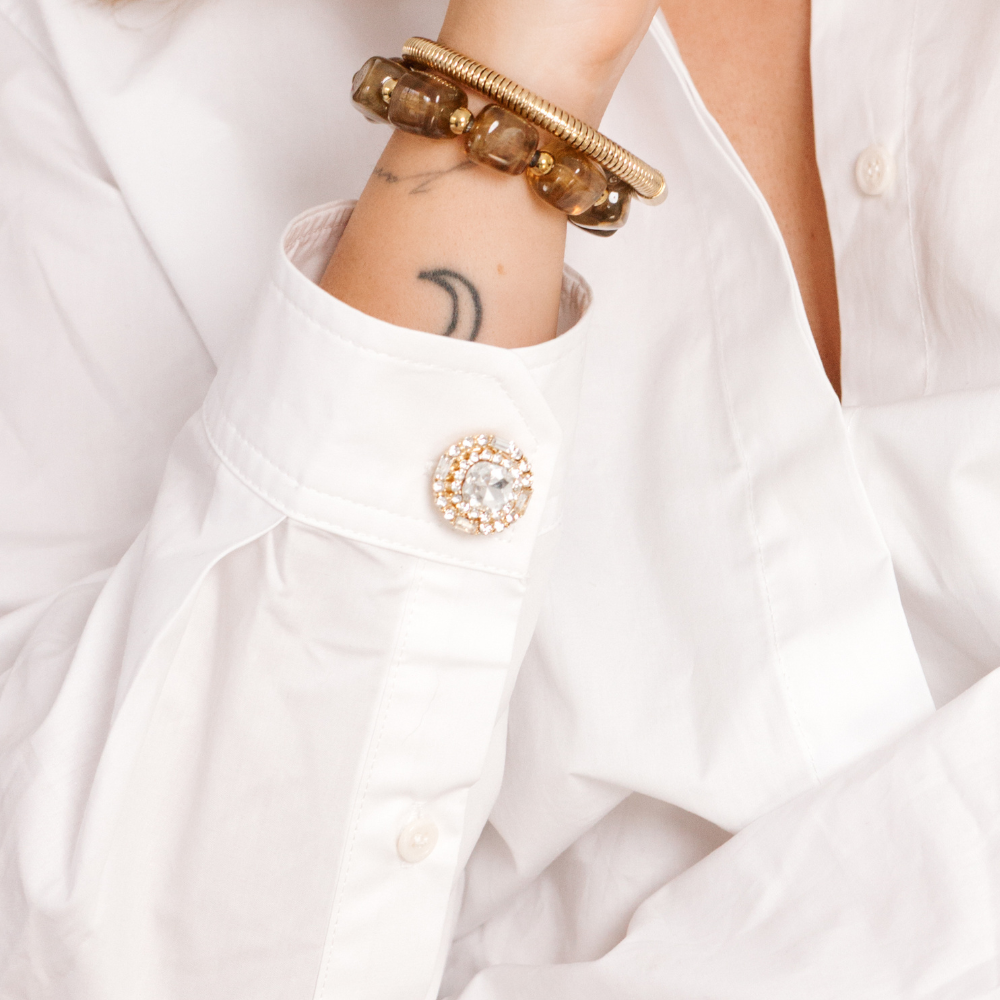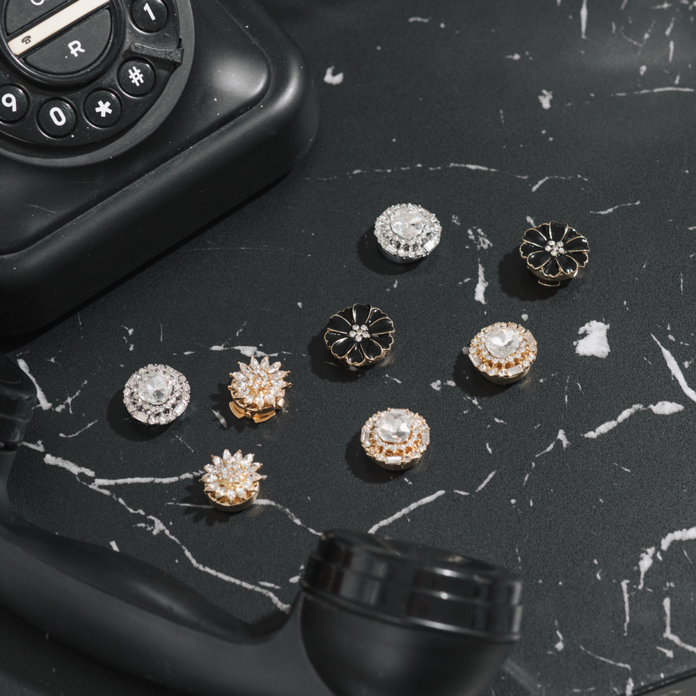 Geef elke blouse, blazer of shirt meteen een chique upgrade met onze button charm. Deze luxe accessoire klik je eenvoudig over de knoop van je kleding, waardoor het lijkt alsof je een sierlijke broche draagt, zonder gaatjes in je stof. De charm is rond vormgegeven met sprankelende zirconia steentjes, waardoor hij prachtig schittert bij elke beweging. Ideaal voor feestjes, zakelijke outfits of gewoon voor een dagelijkse dosis glamour.