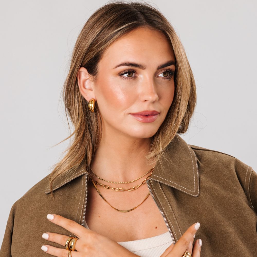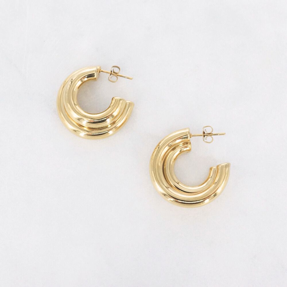 De Inara Hoops zijn de perfecte mix van stoer en chic. Deze gouden hoops van stainless steel hebben een dubbelband design dat nét dat beetje extra geeft aan elke look. Door hun glanzende afwerking en tijdloze vorm passen ze bij alles: van een basic T-shirt tot een elegante avondoutfit. En doordat ze gemaakt zijn van hoogwaardig roestvrij staal, blijven ze mooi van kleur en draag je ze elke dag zonder zorgen! We hebben deze hoops ook in een leuk goud met zilver versie!