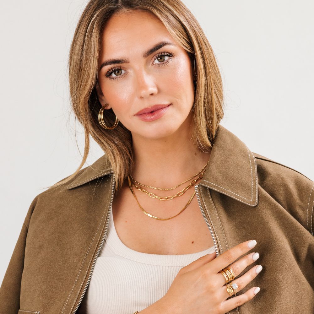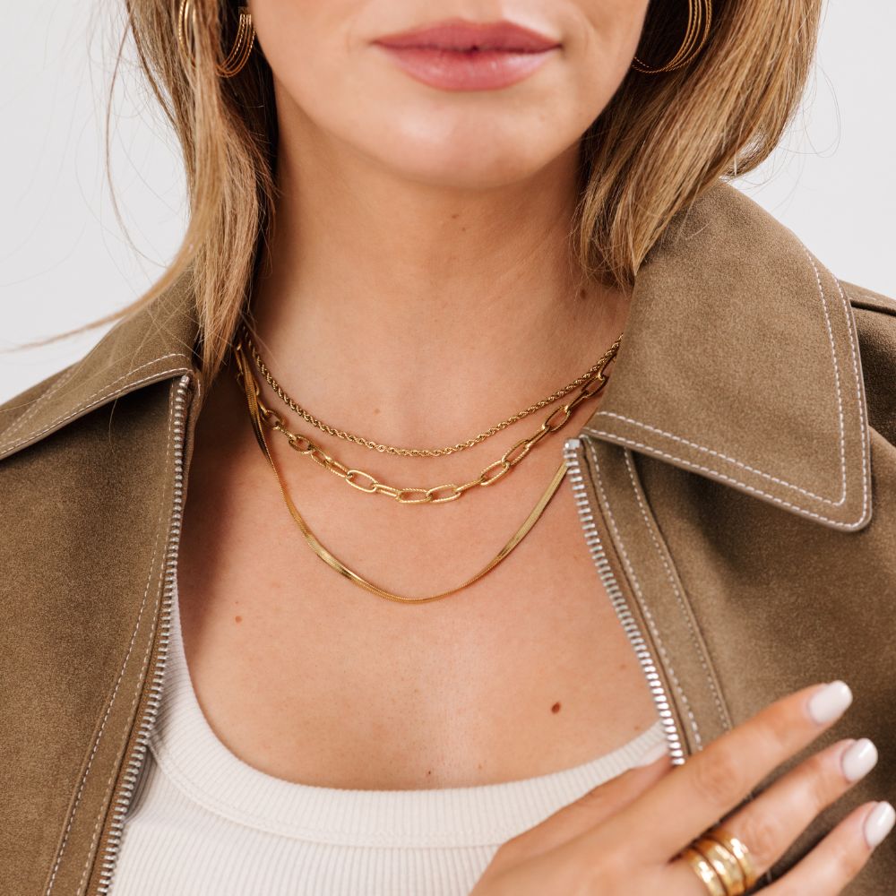 De Olien Layered Necklace is dé ketting voor wie houdt van een gelaagde look zonder moeite. De ketting bestaat uit drie lagen met verschillende schakels: een fijne snake chain, een subtiele schakelketting en een wat grovere ovale schakel. Samen creëren ze een elegante, moderne mix die bij elke outfit past. Gemaakt van stainless steel, dus je hoeft je geen zorgen te maken over verkleuring, want deze beauty blijft lang mooi en glanzend. Draag hem solo voor een statement of combineer met andere sieraden voor een extra persoonlijke touch. Maak je look helemaal compleet met de bijpassende armband!