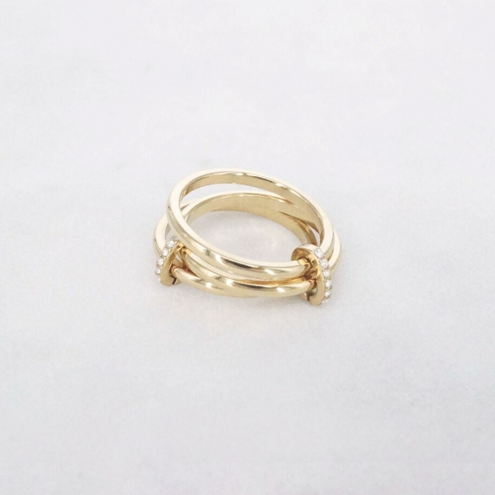 Deze triple loop ring is een stijlvolle en speelse statement ring. De drie gladde, goudkleurige bandjes zijn met elkaar verbonden door twee kleine hoops, afgewerkt met fonkelende zirconia steentjes. Dit subtiele detail geeft de ring een chique sparkle, terwijl het ontwerp toch minimalistisch en modern blijft. Gemaakt van stainless steel met een hoogwaardige goudkleurige plating: verkleurt niet, is nikkelvrij en perfect voor dagelijks gebruik. Draag hem solo voor een clean look of combineer met andere ringen voor een trendy stack.