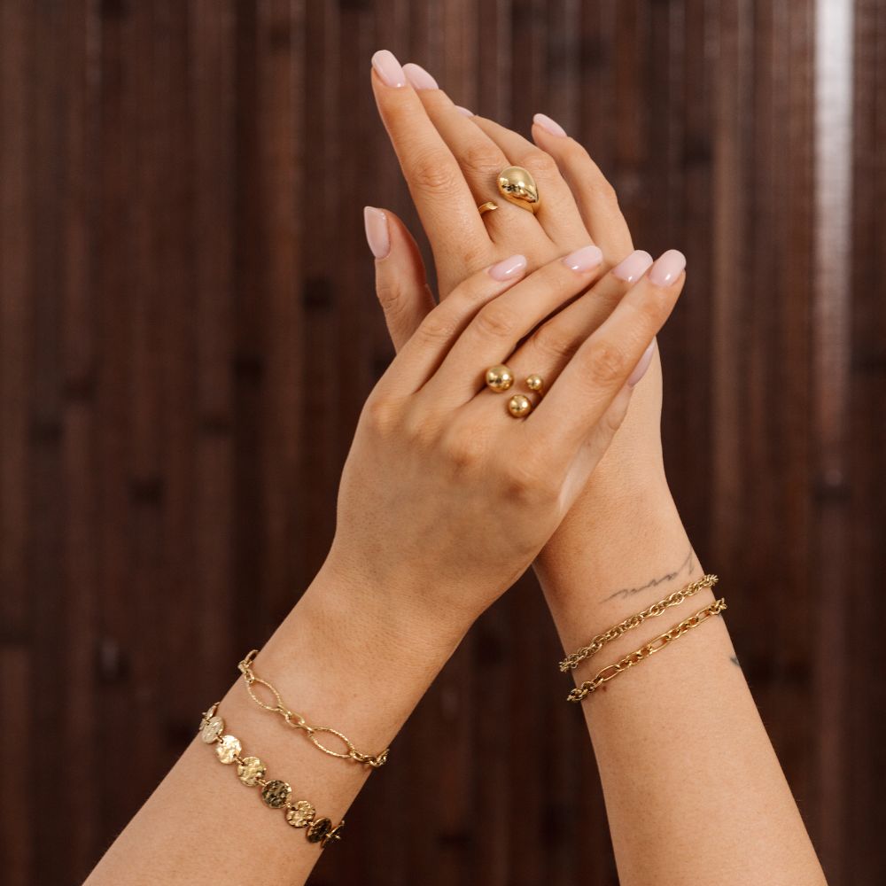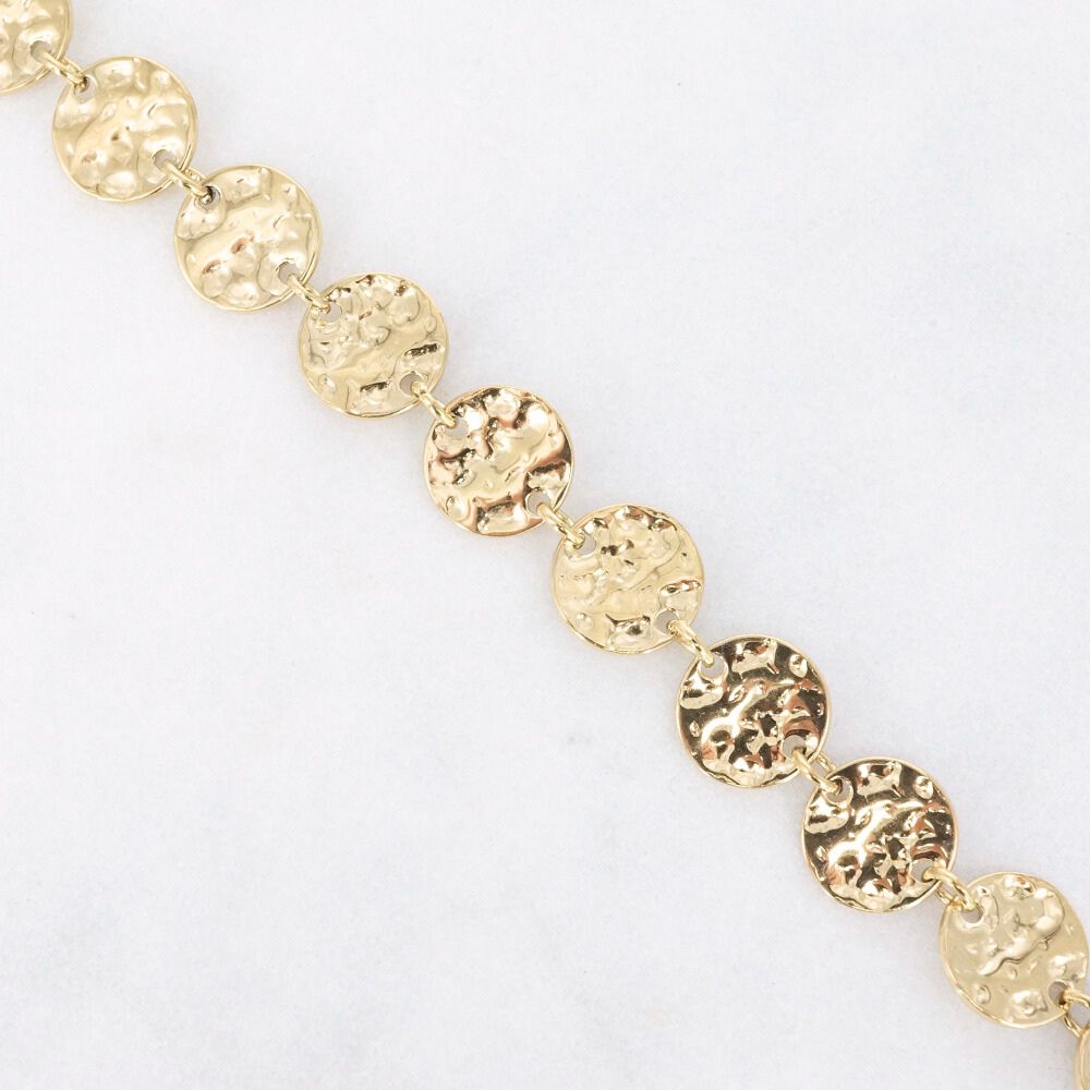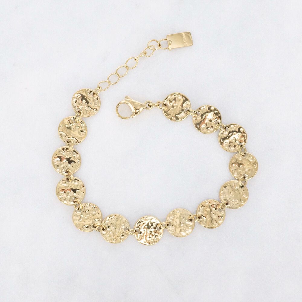 Deze statement armband met ronde schakels is een echte eyecatcher. De organisch gehamerde schijfjes geven de armband een luxe en speelse uitstraling. Gemaakt van hoogwaardig stainless steel, waardoor de armband duurzaam, waterproof en allergie-vrij is. Dankzij de verstelbare sluiting past de armband mooi om de pols. Perfect om solo te dragen als blikvanger of te combineren met andere gouden sieraden uit de collectie.