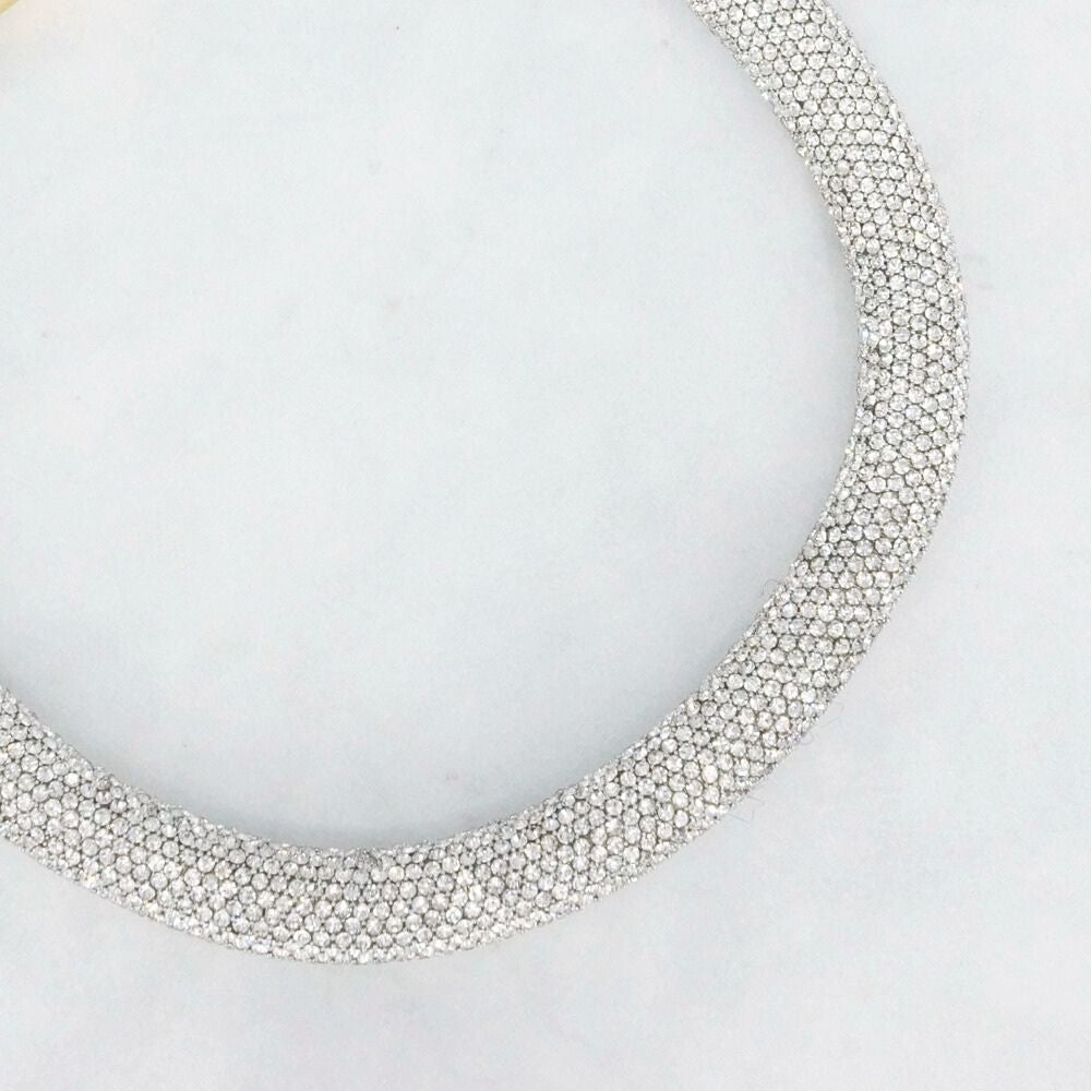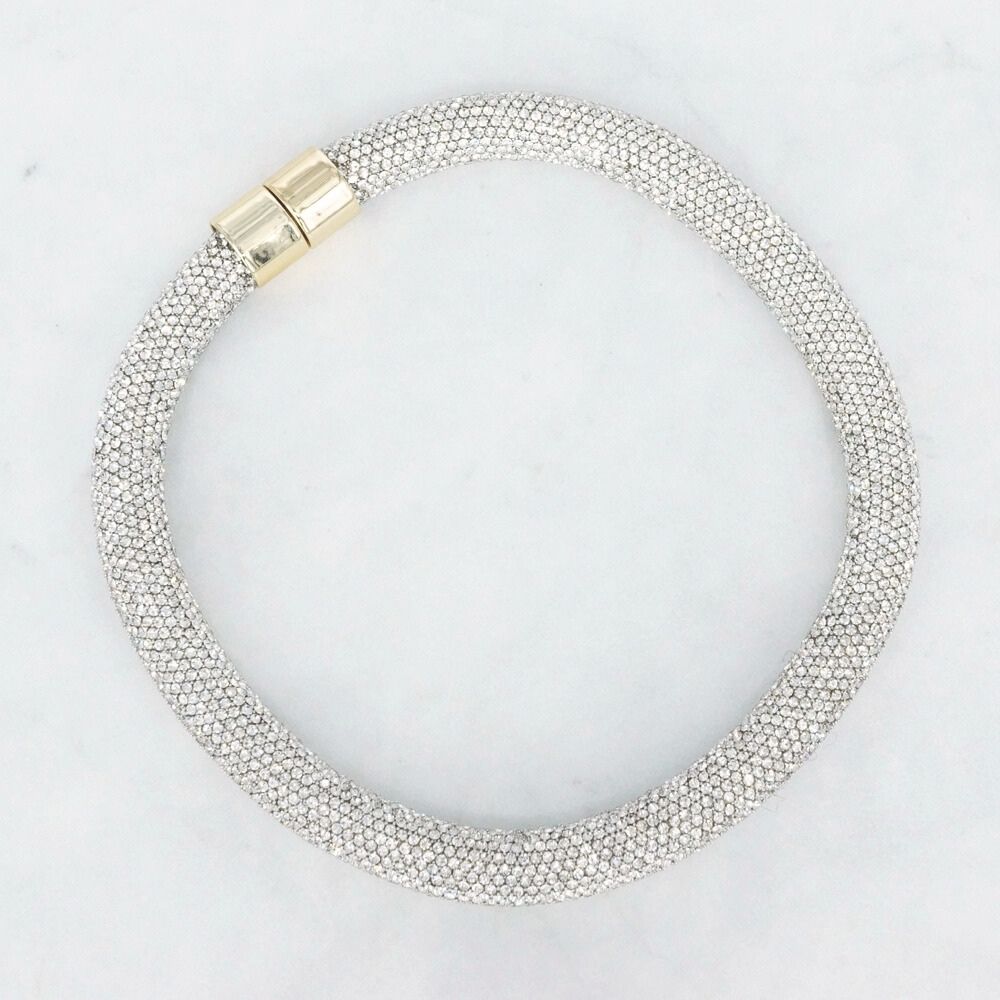 Op zoek naar een opvallend statement item? Deze glinsterende choker is volledig bedekt met duizenden kleine kristalheldere steentjes die een schitterende sparkle geven bij elke beweging. Het zachte, ronde design maakt hem comfortabel om te dragen, terwijl de luxueuze look perfect past bij party outfits, galajurken of een chique dinner fit. De choker sluit met een stevige magneetsluiting waardoor je ‘m makkelijk aan- en uitdoet, zonder gedoe met haakjes. Door de mix van een minimalistische vorm en all-over sparkle is dit een echte showstopper die je look meteen naar een hoger niveau tilt.
