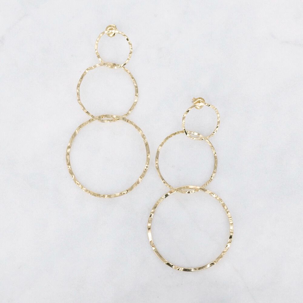 Deze elegante lange oorbellen zijn gemaakt van hoogwaardig stainless steel en bestaan uit drie verfijnde ringen in verschillende formaten. De subtiel gehamerde afwerking geeft de oorbellen een luxe glans en een moderne uitstraling. Dankzij het open en lichte design zijn ze comfortabel om te dragen en perfect om een winterse outfit in januari een stijlvolle, vrouwelijke touch te geven!