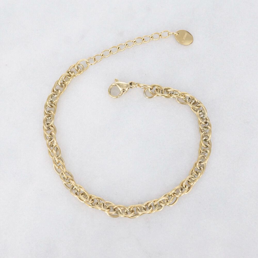 Deze goudkleurige schakelarmband is een tijdloze essential voor elke sieradencollectie. Het verfijnde ontwerp met in elkaar gevlochten schakels geeft de armband een elegante en moderne uitstraling. Gemaakt van hoogwaardig stainless steel, waardoor de armband duurzaam, waterproof en perfect voor everyday is. Dankzij de verstelbare sluiting past de armband comfortabel om de pols. Perfect om solo te dragen voor een minimalistische look of te combineren met andere armbanden voor een gelaagd effect.