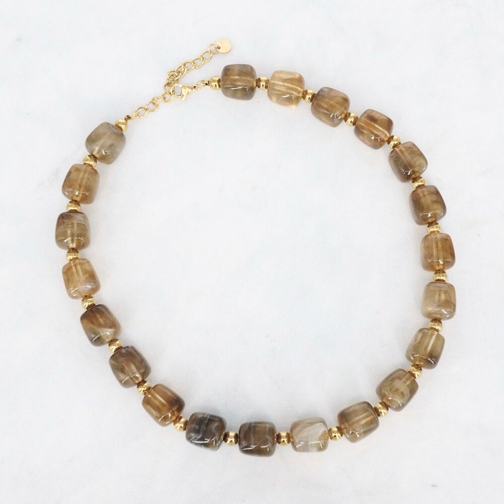 Deze trendy ketting met acryl kralen heeft een elegante, winterse uitstraling dankzij de zachte gemêleerde tinten in beige en bruin. De glanzende kralen worden subtiel afgewisseld met goudkleurige details, wat zorgt voor een verfijnde en warme look. Perfect om een winteroutfit in januari net dat beetje extra te geven. De ketting is afgewerkt met een stainless steel sluiting, die niet verkleurt! Maak je look helemaal compleet met de bijpassende armband.