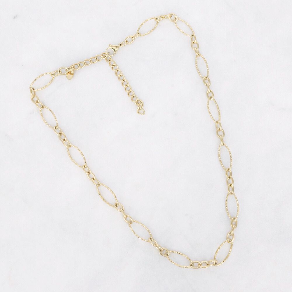 Deze elegante schakelketting is gemaakt van hoogwaardig stainless steel en heeft verfijnde ovale schakels met een subtiel bewerkt detail. Het open ontwerp geeft de ketting een chique, moderne uitstraling en maakt hem perfect voor de wintermaanden en voor daarna. Draag hem solo voor een minimalistische look of combineer met andere kettingen voor een stijlvolle layered effect. De ketting is waterproof, dus perfect voor elke dag of een speciale gelegenheid!