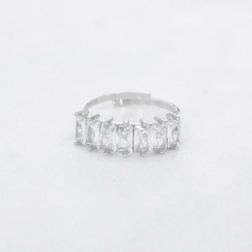 Onze zilveren baguette strass ring is de perfecte mix van chic en minimalistisch. De vijf rechthoekige zirconia steentjes zorgen voor een luxe sparkle die elke look afmaakt. Dankzij het open model is de ring licht verstelbaar en daardoor comfortabel te dragen op verschillende vingers. Draag hem solo voor een subtiele sparkle, of combineer met meerdere ringen voor een moderne stack. Een tijdloze musthave voor feestelijke outfits, maar ook prachtig bij je dagelijkse stijl.