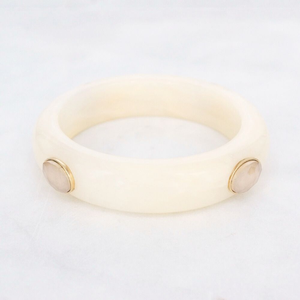 The Liv Beige Bangle is an elegant and timeless bracelet. Crafted from resin, it's finished with beautiful cubic zirconia stones, subtly framed with gold-tone details. The warm beige hue gives the bracelet a refined, natural look that pairs beautifully with both gold and neutral tones. Thanks to the lightweight material, the bangle is comfortable to wear and makes a stylish addition to any outfit, from casual to chic. We also have this bangle in brown and black !