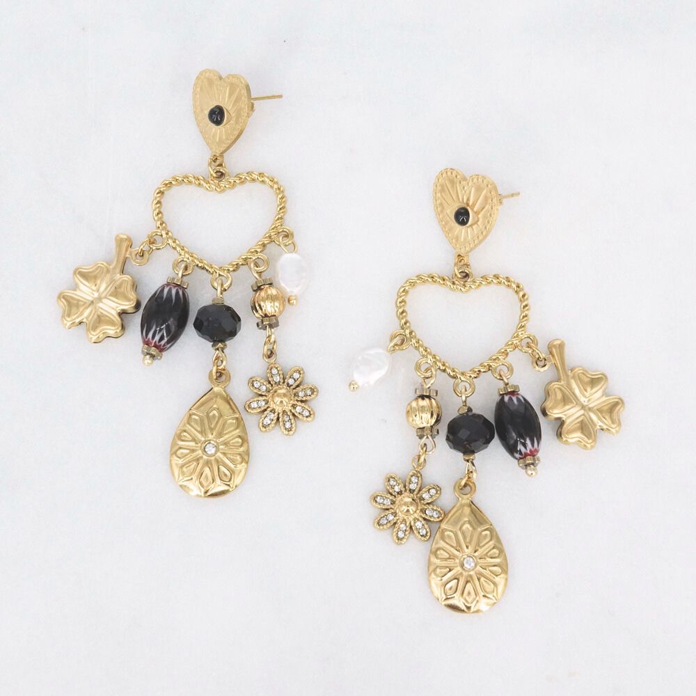Make your look shine with these romantic and playful earrings. These statement earrings are crafted from high-quality stainless steel and feature an elegant heart-shaped pendant with a variety of charming charms: a four-leaf clover, a flower, shiny beads, and a gold-tone teardrop charm. The combination of gold, black, and pearl makes these earrings versatile, perfect for a festive outfit or to add a touch of luxury to your everyday look.